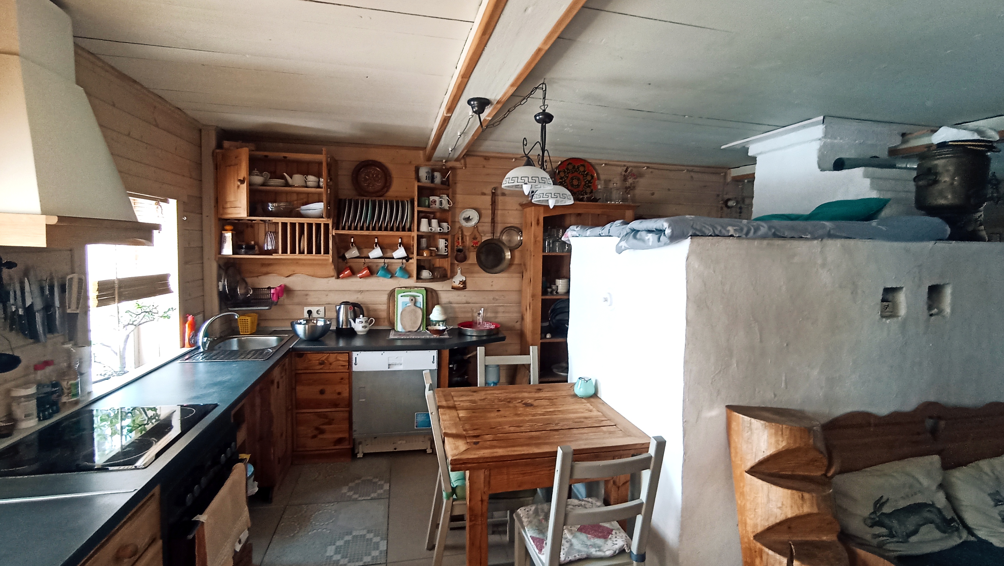 Банный сруб мы иногда сдаем как жилье. Здесь есть все необходимое: комната отдыха для банщиков вполне себе кухня со столовой, где есть все необходимое для приготовления еды, большой холодильник, большой стол с лавками и стульями, лежанка для отдыха и сна, телевизор. На спальном чердачке (мансарда с чердачной выдвижной лестницей) расположились удобные матрасы для сна: двухместный, шириной 160 см и одноместный, шириной 90 см. Есть еще небольшой тоненький матрасик. Полноценным спальном местом его не назовешь, но посидеть-поваляться с телефоном или книжкой вполне можно. Есть стеллажик и пуфы. Большой душ с обливным устройством с ледяной водой из колодца, туалет. Парилка, пользование которой оплачивается отдельно, дабы не перегреть, что опасно! Бронирование происходит по телефону или whatsapp, указанному на сайте. Предоплата в размере 50 % от общей суммы бронирования после подтверждения дат заезда.